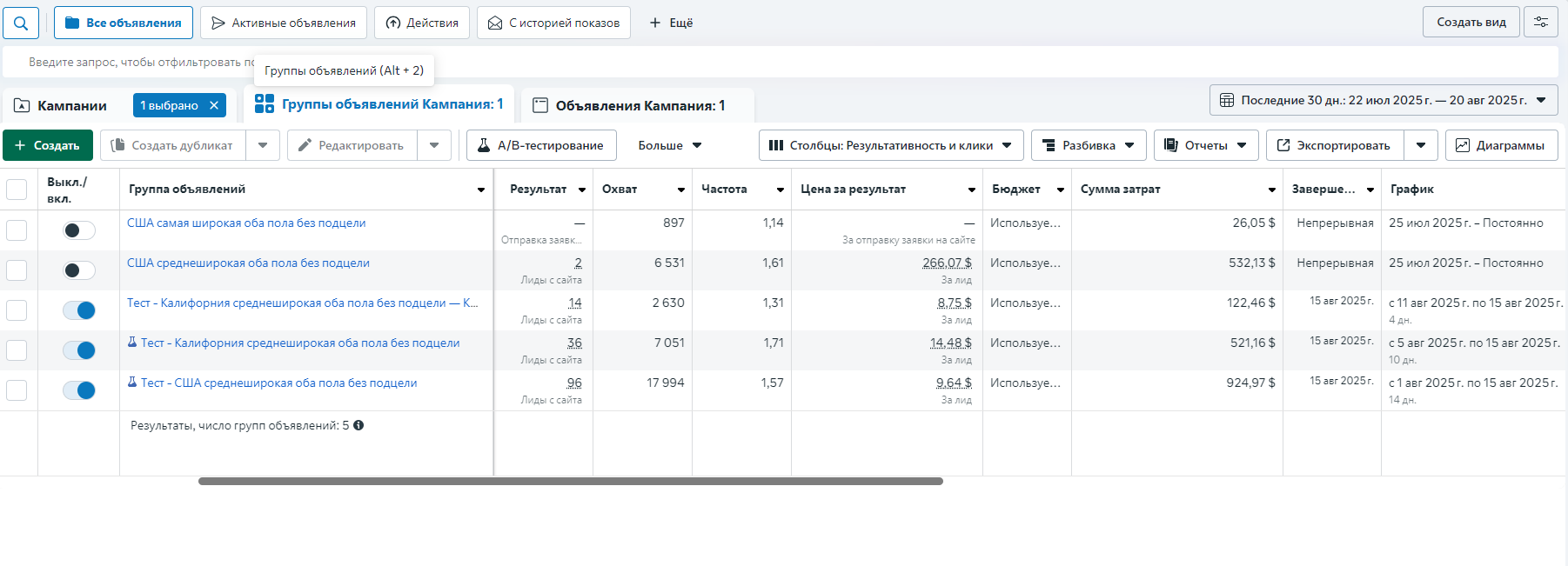 — Протестировали 2 цели и 3 подцели через разные настройки и креативы