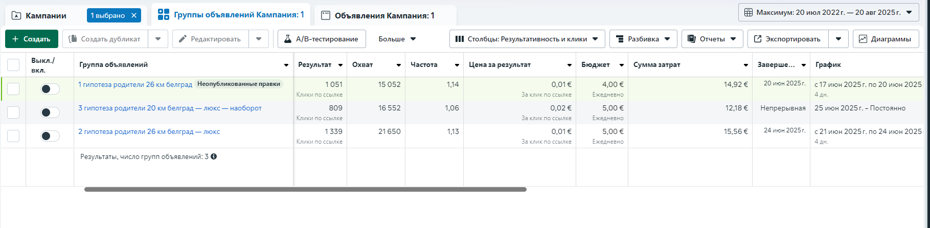 — получили нужный результат и первые выводы по рынку уже через неделю и остановили тесты через 2 недели