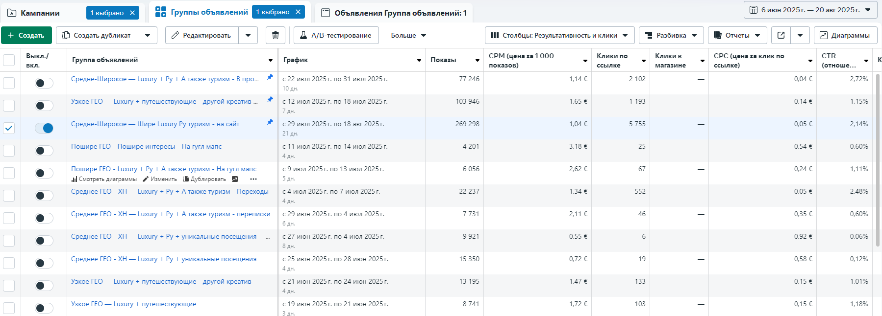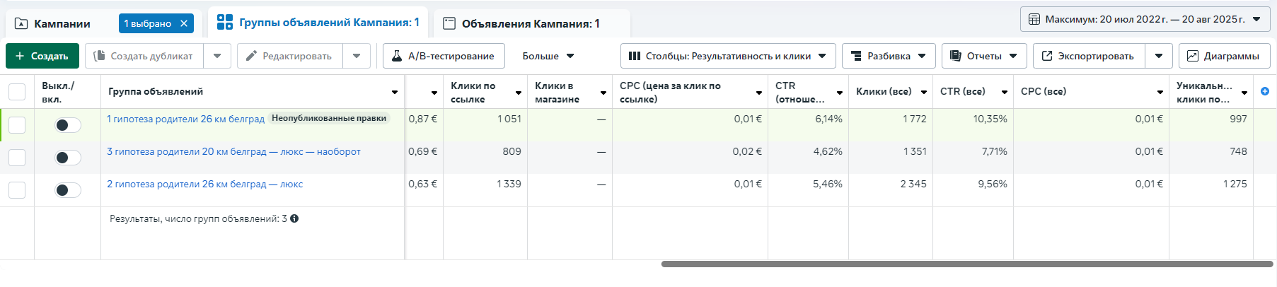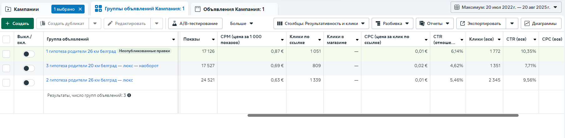 Не было возможности настроить корректный пиксель, поэтому единственная цель, показавшая конвертное число конверсий — маршруты в google Maps. Результаты первой же настройки по этой цели: