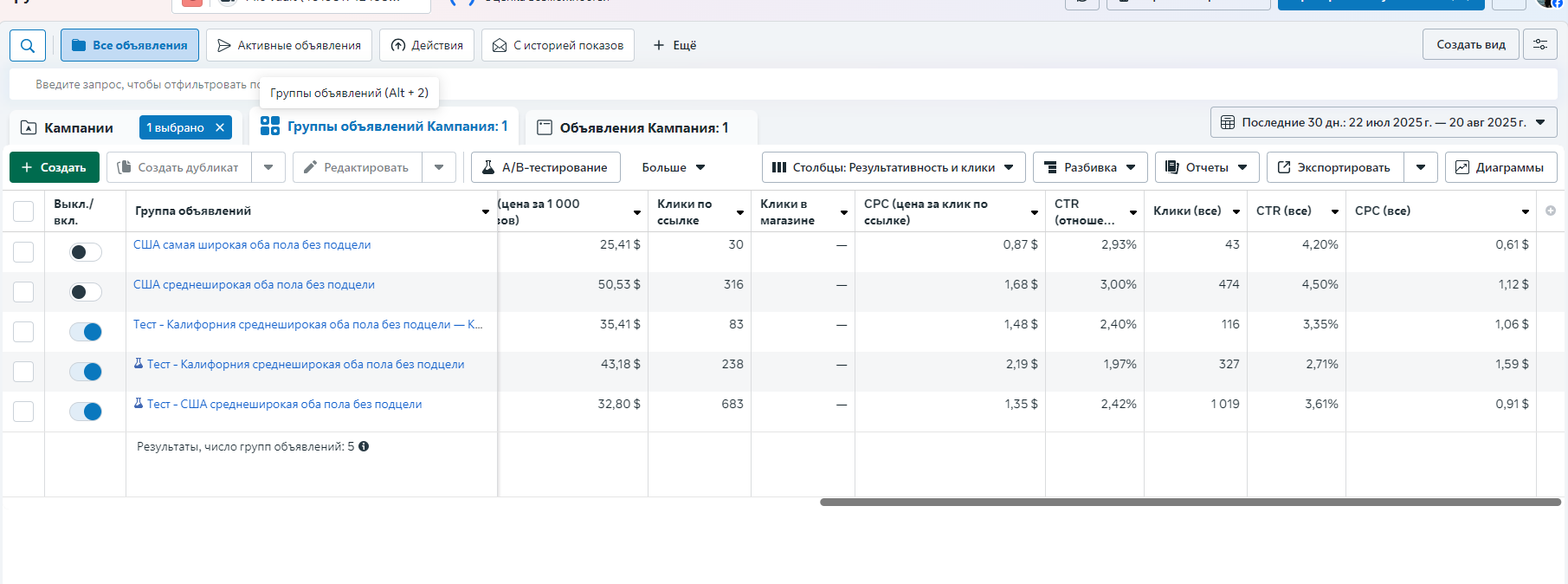 — Протестировали 2 цели и 3 подцели через разные настройки и креативы