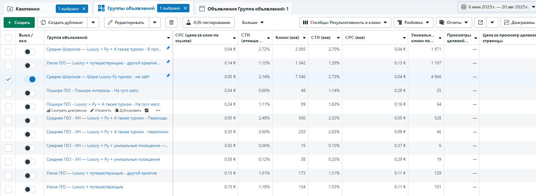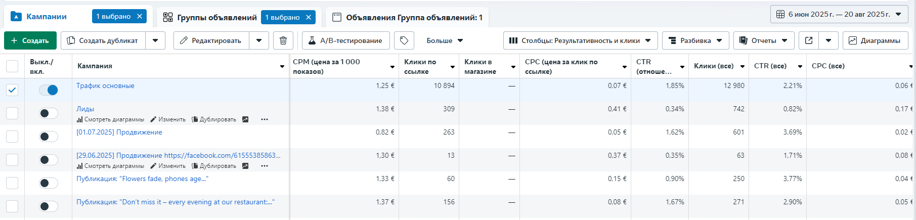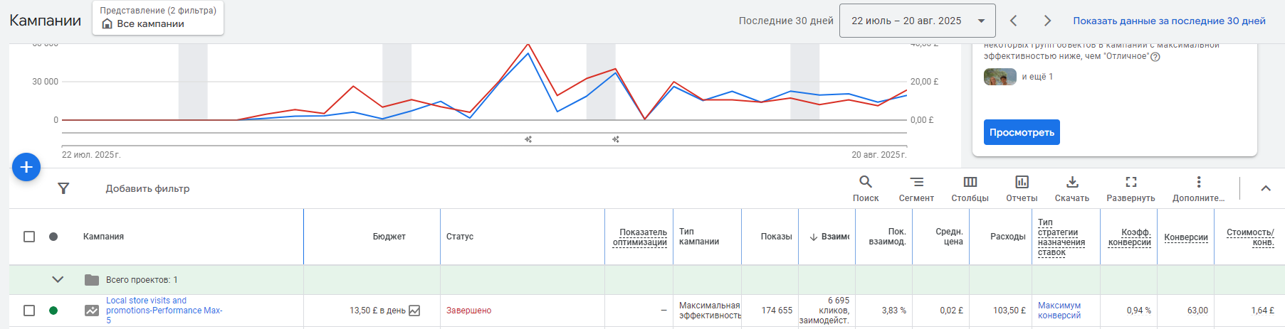 Не было возможности настроить корректный пиксель, поэтому единственная цель, показавшая конвертное число конверсий — маршруты в google Maps. Результаты первой же настройки по этой цели:
